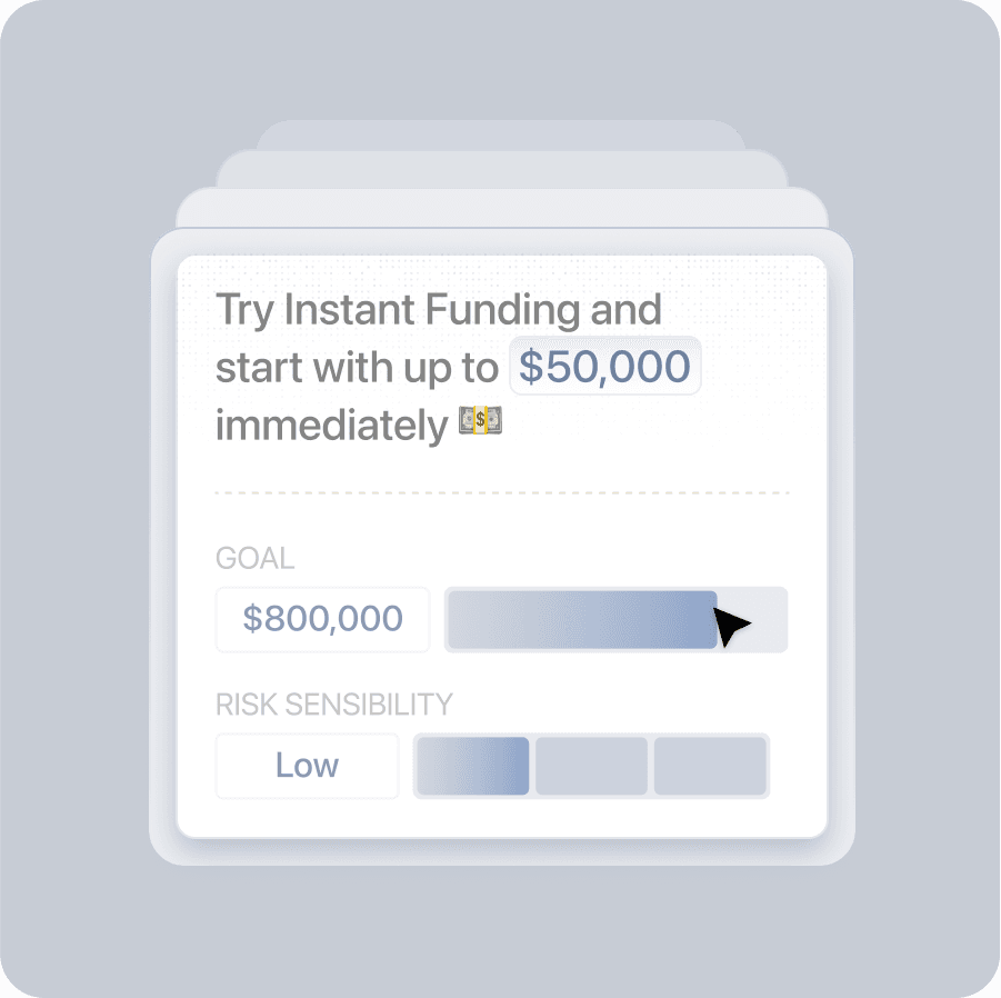 Prefer a head start? Try Instant Funding—skip the audition, start with up to 50.000 USD immediately. Same profit splits, slightly tighter draw‑down limits. Perfect if you already have a verified track record.